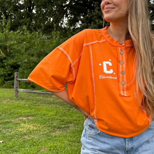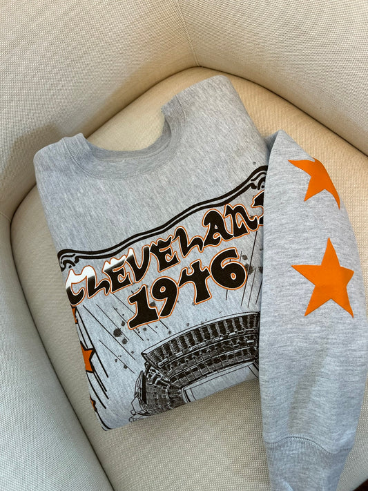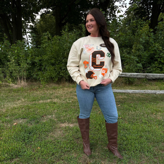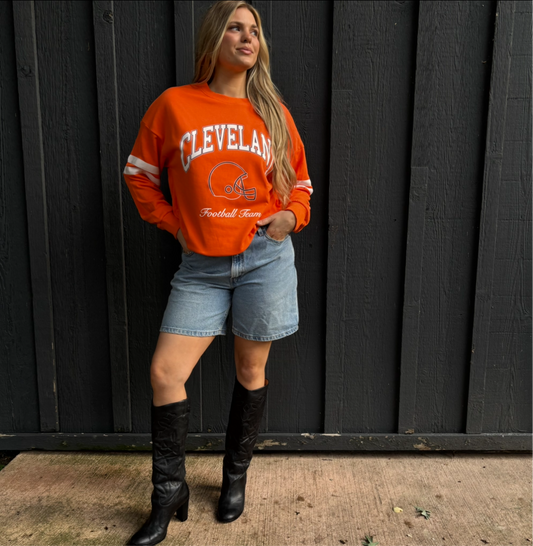 Cleveland Football Team Crewneck - Orange with Striped Sleeves