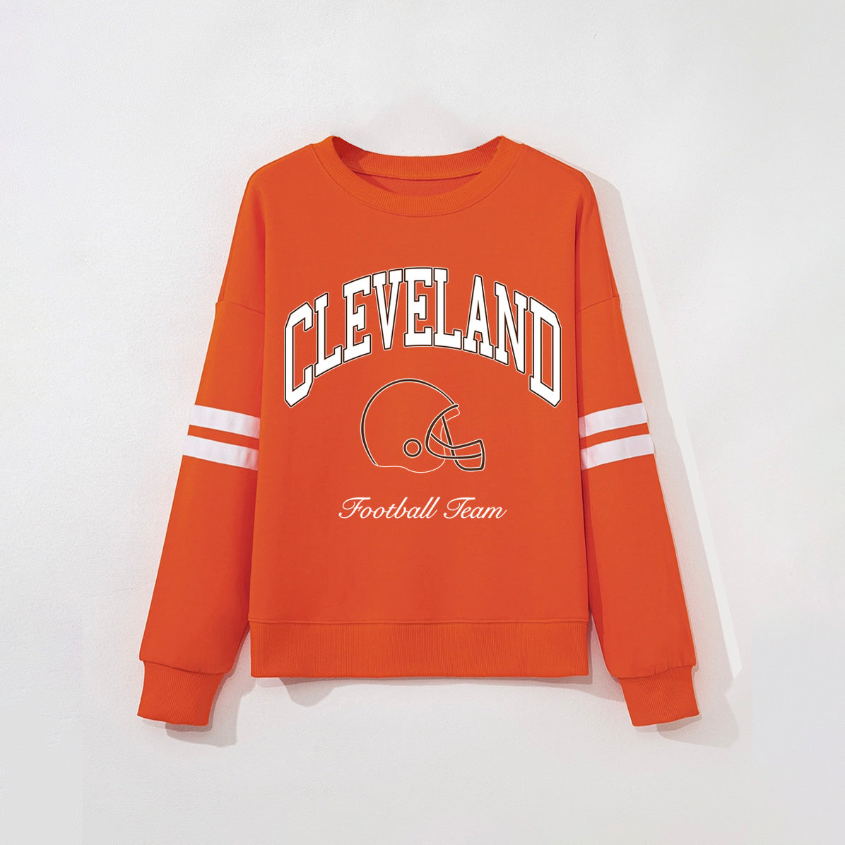 Cleveland Football Team Crewneck - Orange with Striped Sleeves