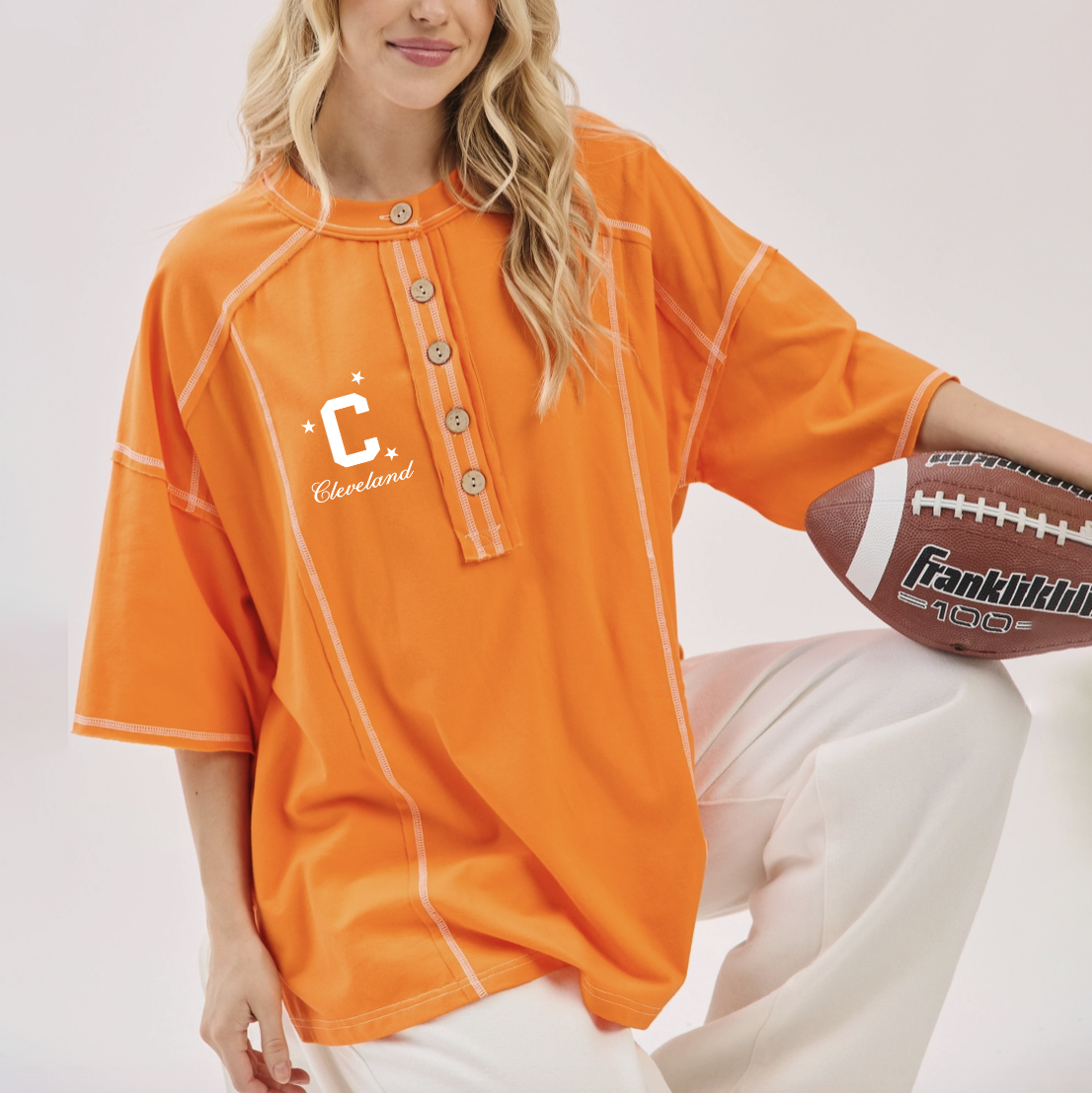 Keep it fun and stylish this football season with this all new oversized henley t-shirt.