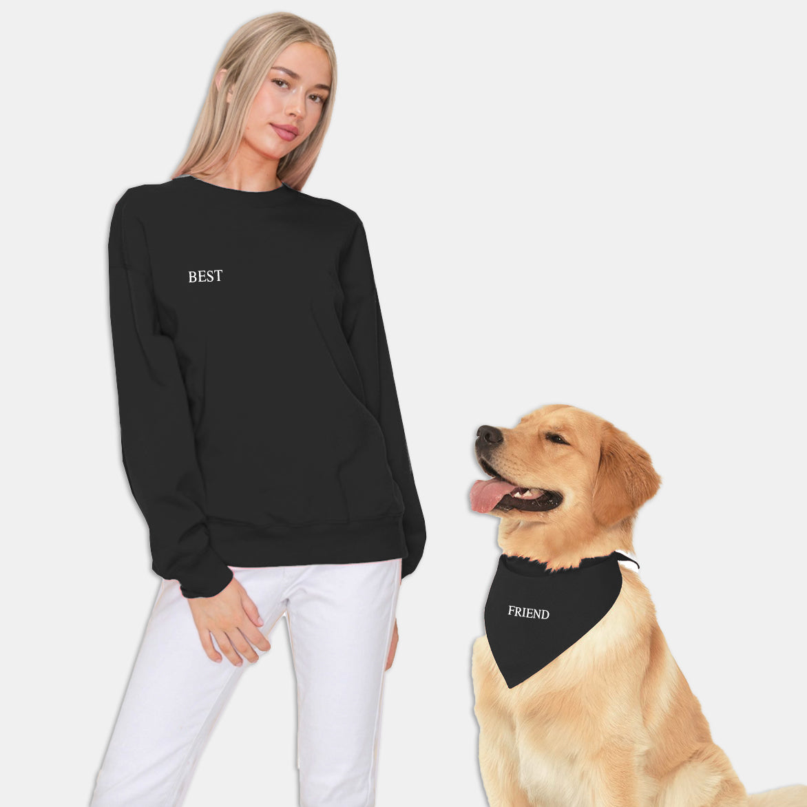 Put your name, something you love, or a fun phrase on this custom crewneck sweatshirt and dog bandana.