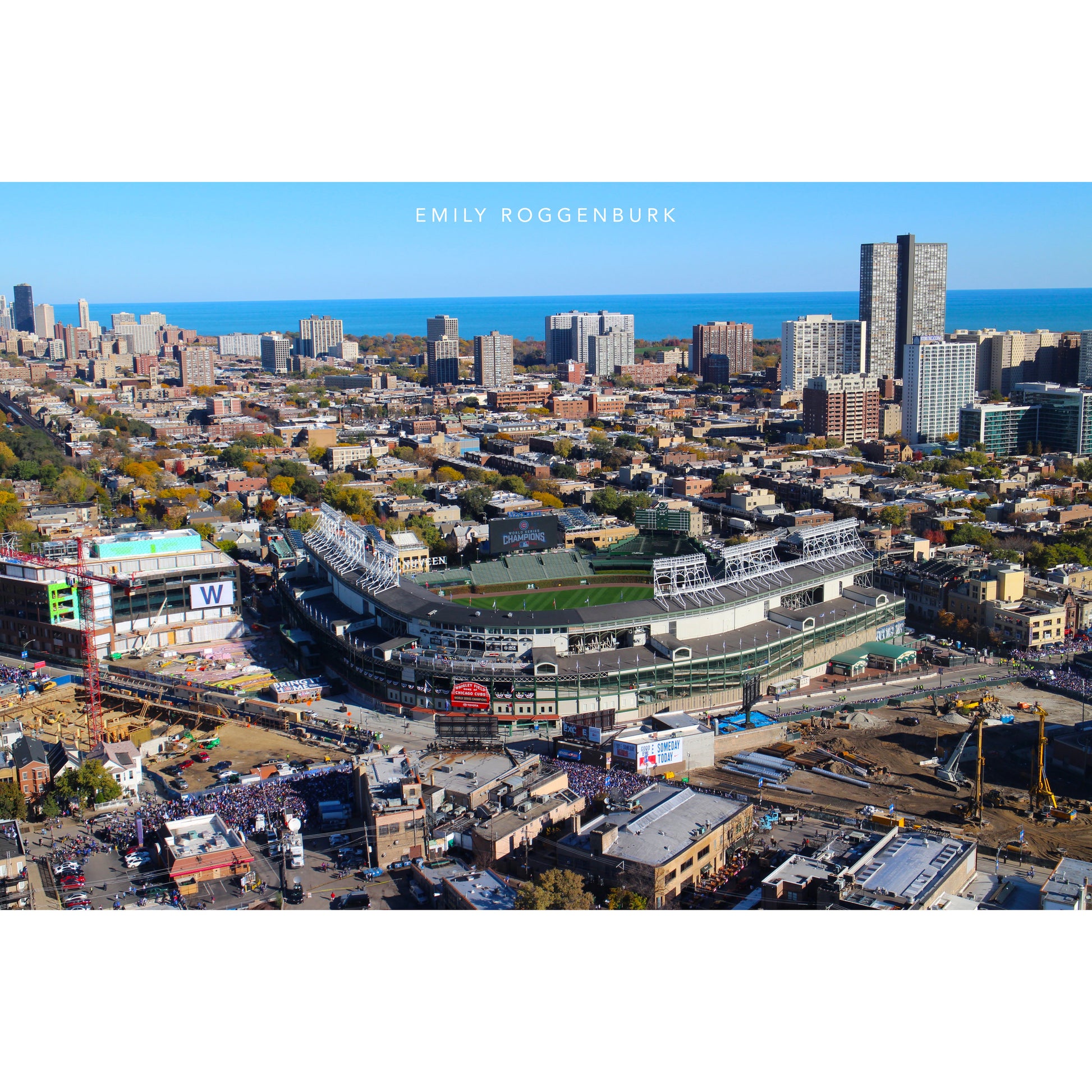 The "Fly The W" photo was taken by Emily Roggenburk from a helicopter during the Chicago Championship Parade on November 4, 2016.