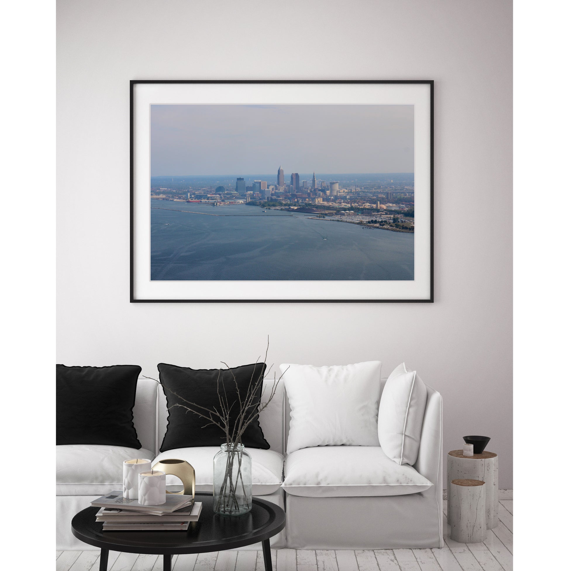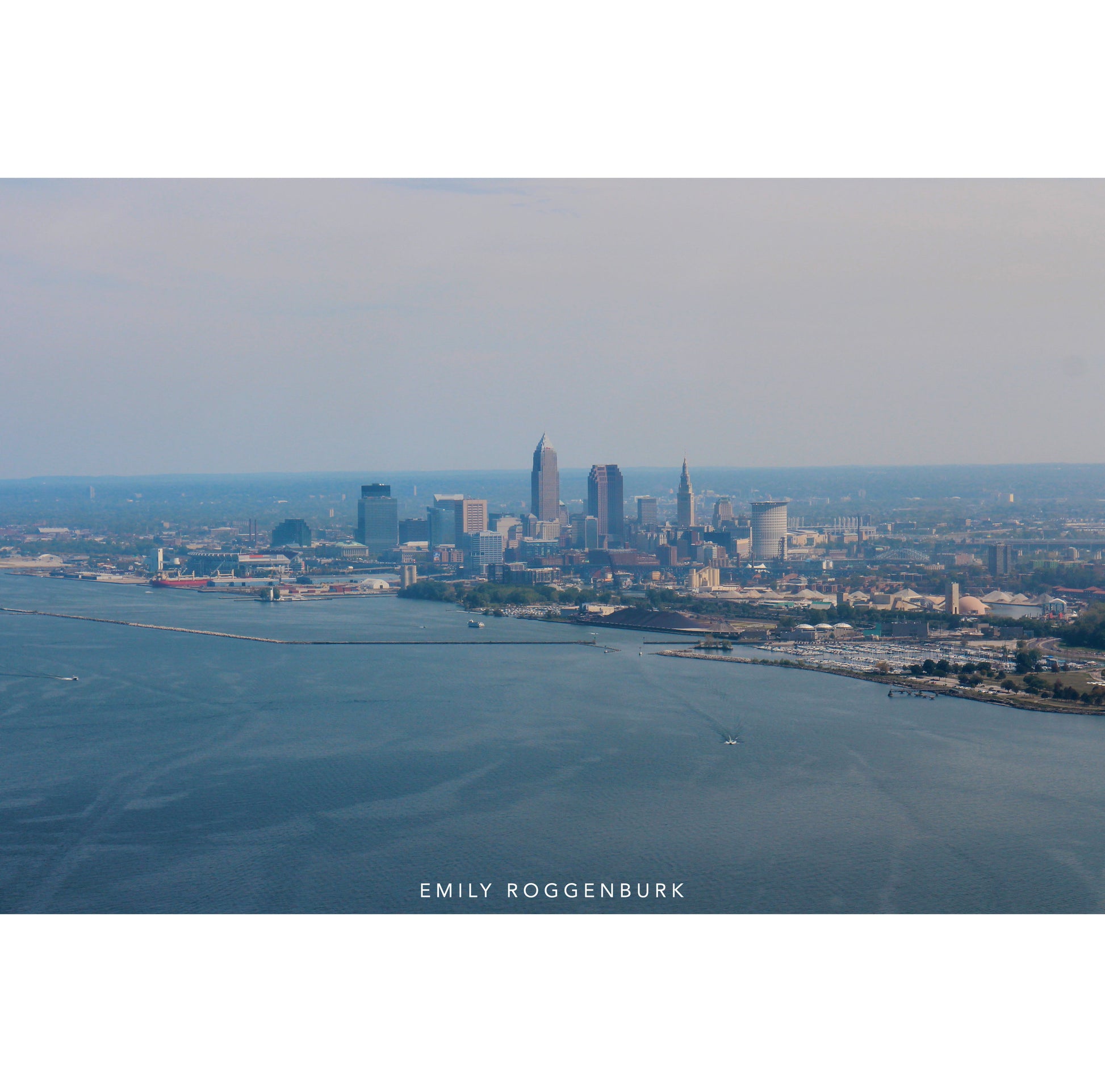 The "Land That I Love" photo was taken by Emily Roggenburk from a helicopter in September of 2017 along the shores of Lake Erie looking at the Cleveland skyline.